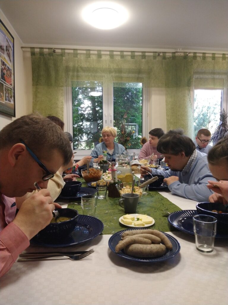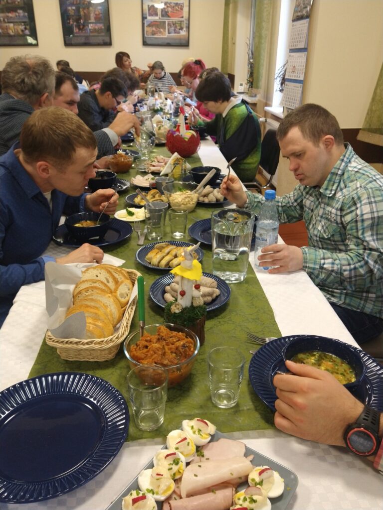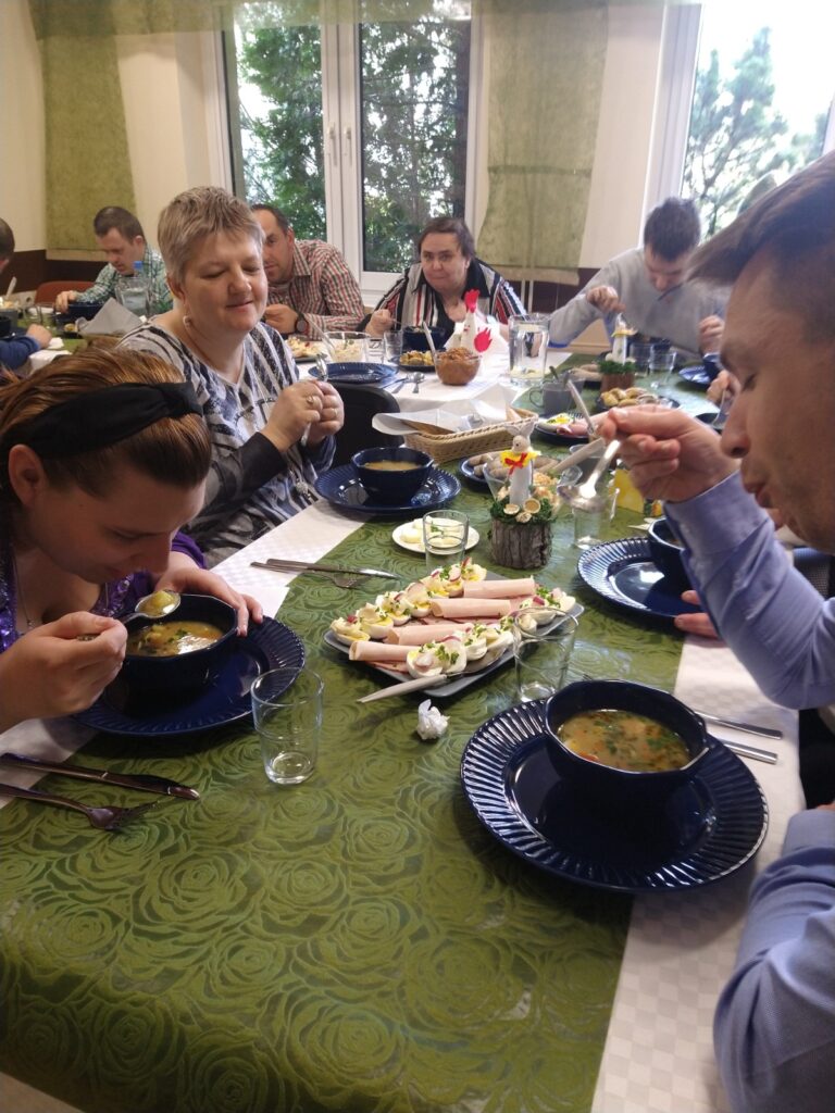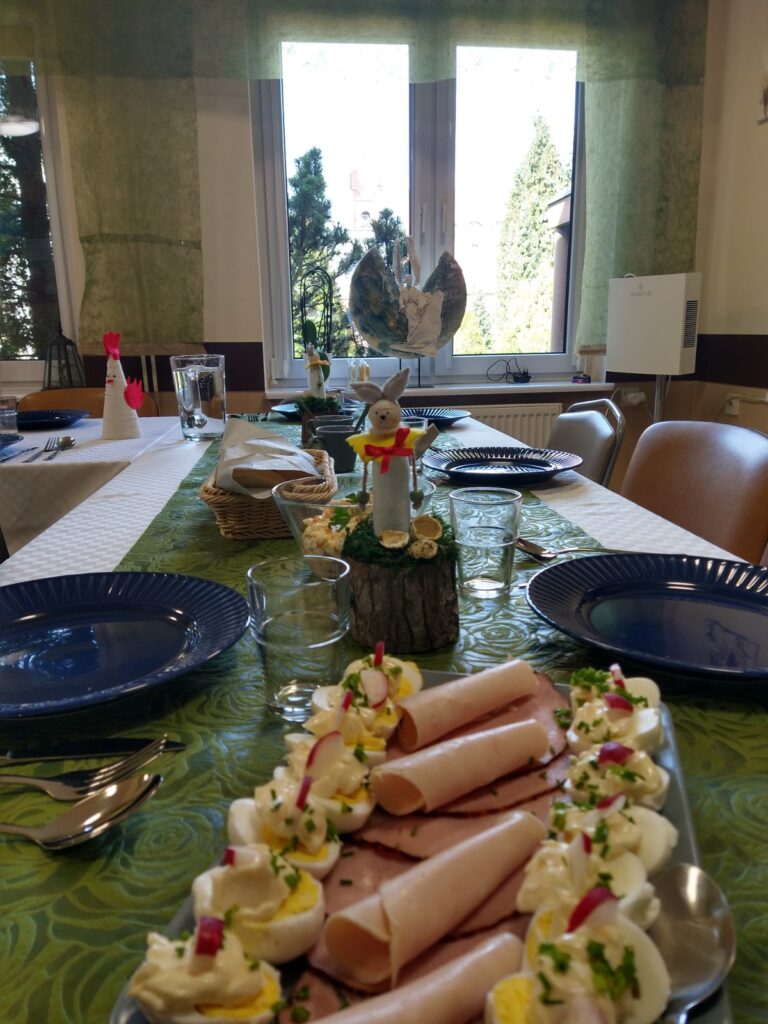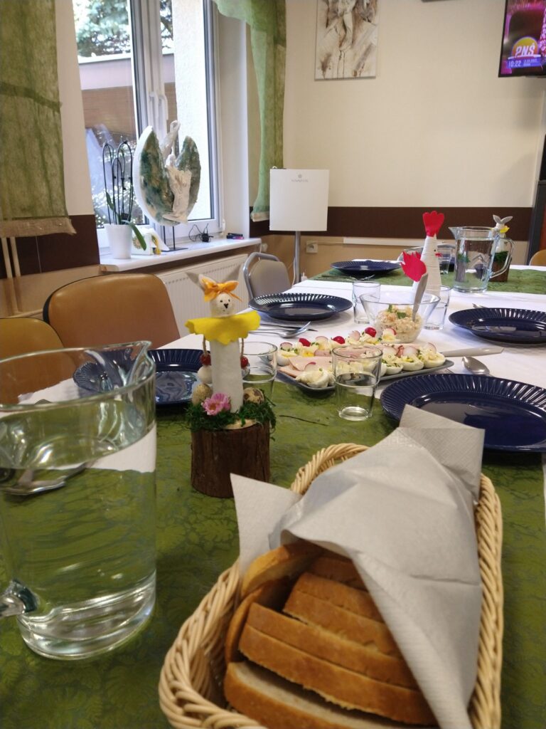 Jak święta, to widomo również porządki przedświąteczne, których w ostatnim czasie było bardzo dużo. Lecz najważniejszym wydarzeniem było wspólne przedświąteczne śniadanie wielkanocne. Nie zabrakło ciepłych słów Pana Kierownika oraz prezentów dla całej naszej społeczności. Na świątecznym stole tego dnia pojawił się żurek, bigos, biała kiełabasa, mazurek, babka oraz najważniejsze, czyli jajka. Tego dnia udało się spotkać ze wszystkimi uczestnikami DPM, co nas bardzo ucieszyło, ponieważ na każdego czekały prezenty. Zapraszamy do obejrzenia krótkiej fotorelacji.