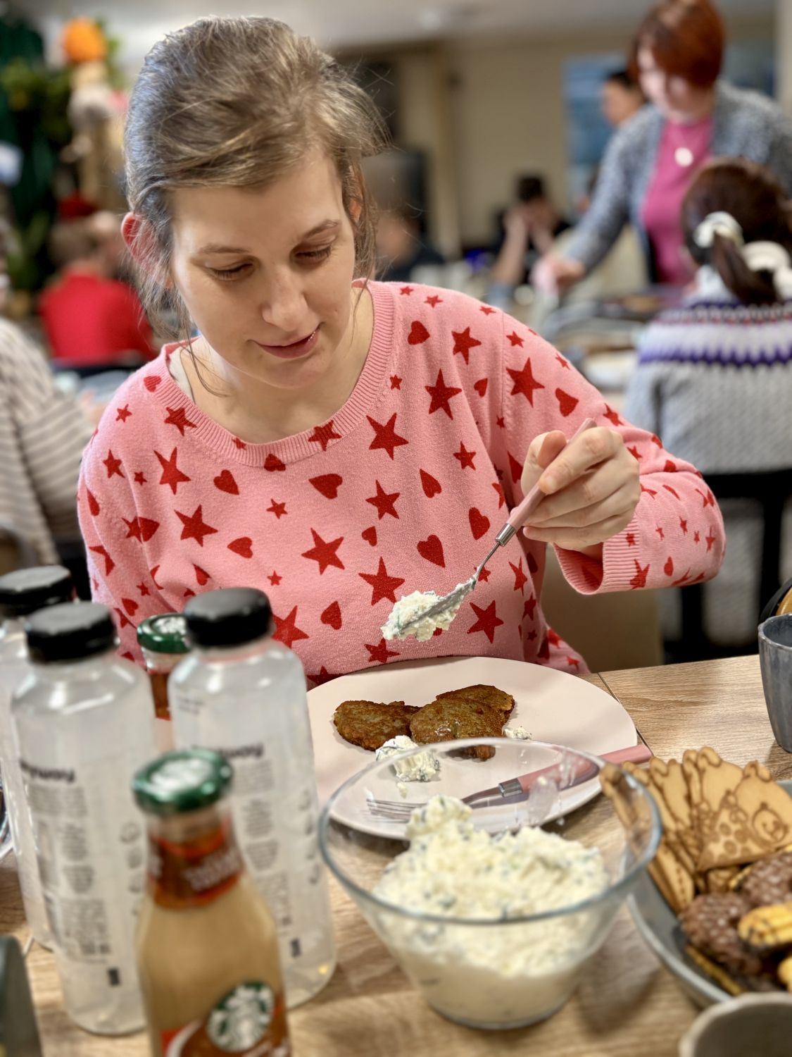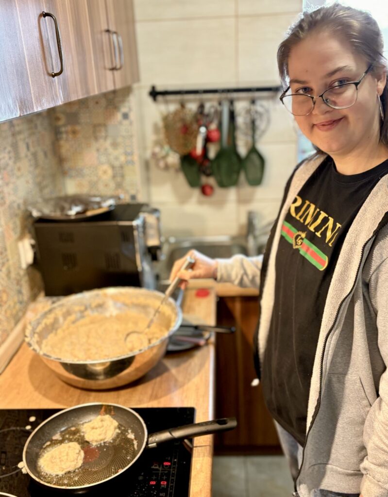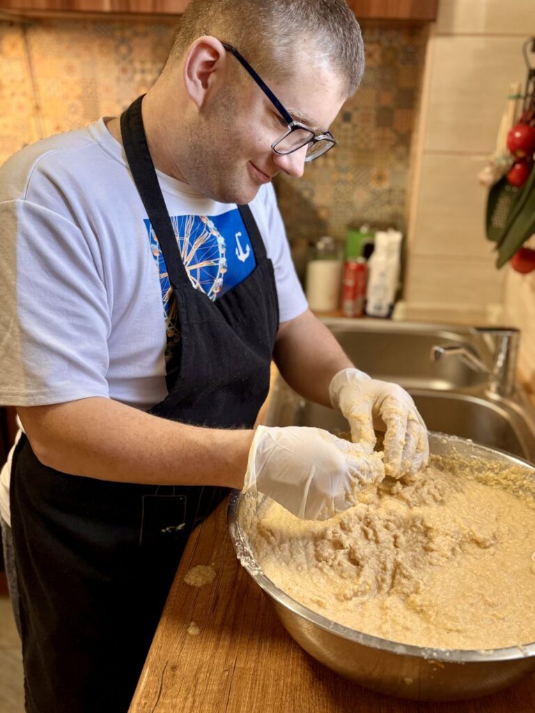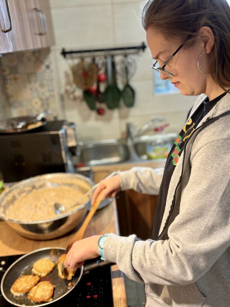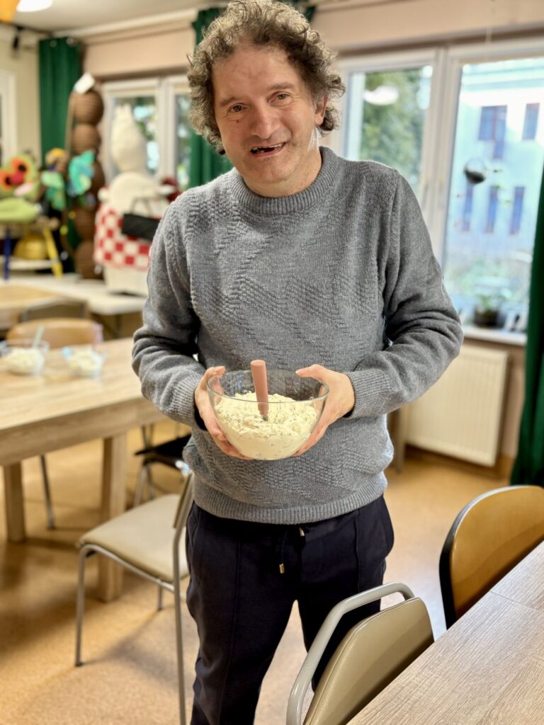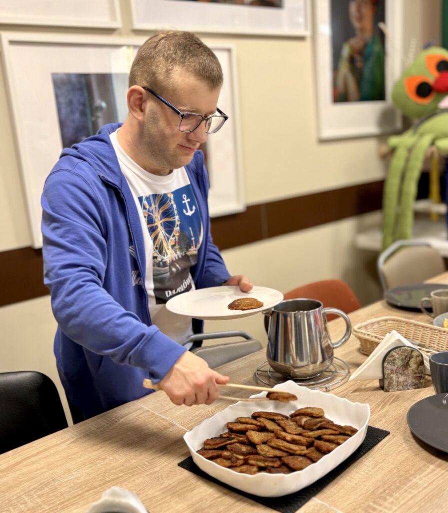 W naszym Domu dużą sympatią cieszy się terapia kulinarna. I nic w tym dziwnego, bo na zajęciach powstają pyszne dania, które cieszą nasze podniebienia.  Ostatnio wspólnie zrobiliśmy plendze. Obieraniem ziemniaków zajęliśmy się wszyscy, oczywiście jak zawsze przodowała w tym Gosia i obrała ich najwięcej. Masę ziemniaczaną wymieszał dokładnie Dawid, a smażeniem placków zajęła się Kinga. Musiała dość długo stać przy patelni, ale było warto. Tomek przygotował gzik, który był smacznym dodatkiem do naszych placków. Komplementom pod adresem kucharzy nie było końca.  Na zajęciach nie tylko ćwiczymy nasze umiejętności kulinarne i manualne, ale również świetnie się integrujemy i budujemy poczucie wspólnoty.