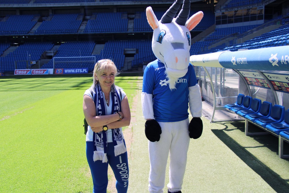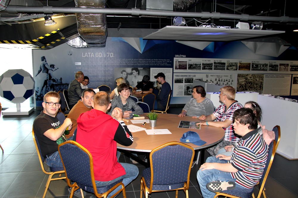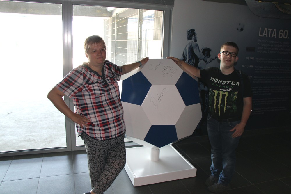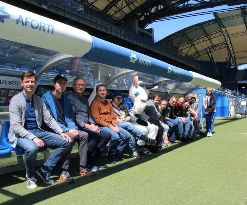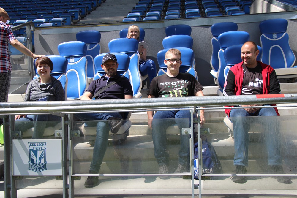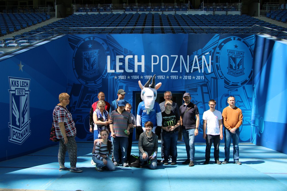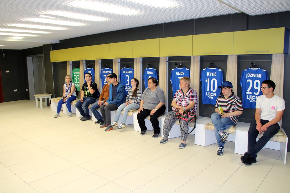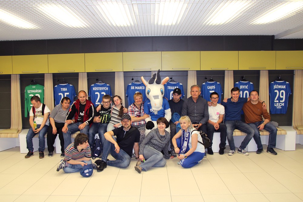 No i stało się! Grupa kibiców drużyny Lech Poznań składająca się z naszych domowników wybrała się na podbój Stadionu Inea Poznań i to w jakim towarzystwie? A no, w towarzystwie maskotki drużyny, czyli w towarzystwie Koziołka. Tuż po dotarciu na ulicę Bułgarską, pierwsze swoje kroki skierowaiśmy na obiad, który chyba spaliliśmy wędrując długimi korytarzami stadionu. Zwiedzanie zaczęliśmy przy sklepie z pamiątkami dla kibiców. Pierwszym miejscem, gdzie się zatrzymaliśmy na pierwsze zdjęcia była murawa i ławka rezerwowych, następnie tunel – Strefa Zero, gdzie drużyny zbierają się do oficjalnego wyjścia z szatni na murawę w celu rozpoczęcia zmagań. Kolejnym zaskoczeniem była przyjemność zwiedzania szatni gospodarzy, skąd szybko przeszliśmy do sali rozgrzewkowej, gdzie mogliśmy wcielić się skórę piłkarzy. W sali rozgrzewkowej każdy ze zwiedzających miał możliwość strzelić po kilka goli na przygotowane dla nas mini bramki, gdzie na bramce stanął nie kto inny jak nasz towarzysz „Koziołek”. Po takich zmaganiach piłkarskich zostaliśmy zaprowadzeni do Korytarza Sław oraz holu głównego, a stamtąd do restauracji klubowej, gdzie mogliśmy rozwinąć się artystycznie kolorując podobizny piłkarzy Klubu Lech Poznań. Na pewno było to dla nas niezwykłe spotkanie, które zostanie w naszej pamięci na długie lata, a plakat z podpisami piłkarzy, który otrzymaliśmy nam to ułatwi.