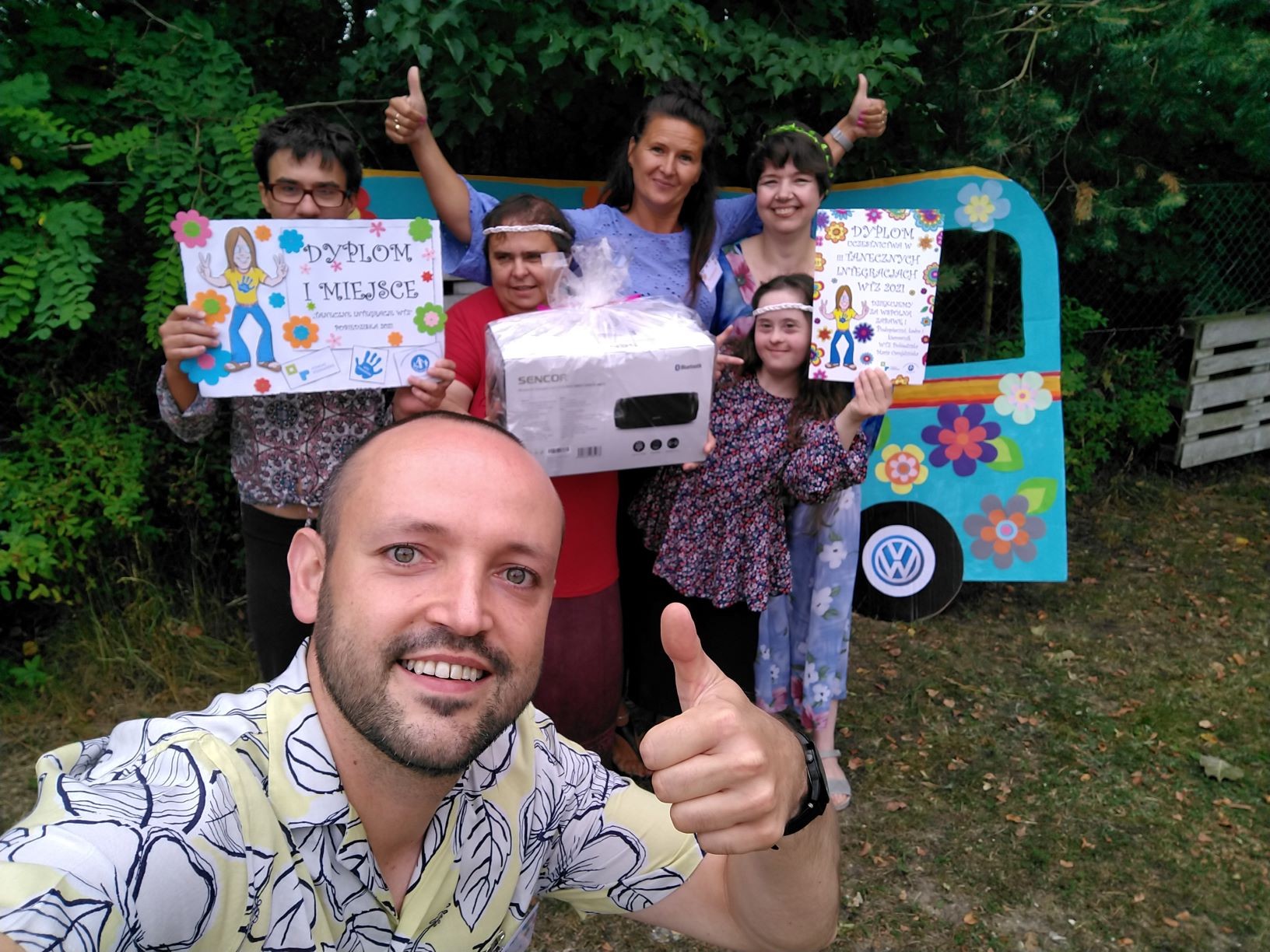 Na zakończenie tygodnia reprezentacja Naszego Domu Pomocy Maltańskiej wybrała się do Pobiedzisk na powiatową imprezę pod nazwą „Taneczne Integracje”. Sam wyjazd wiązał się z wieloma emocjami, ponieważ była to pierwsza impreza, w której mogliśmy spotkać znajomych z innych placówek. Najwięcej stresu było z prezentacją układu tanecznego, który przygotowany był pod nadzorem Pani Ani. Na miejscu czekał na nas ogromny namiot, który posłużył jako sala taneczna. Nie zabrakło kolorów, muzyki, tańca oraz dobrej energii! Warto zaznaczyć, że całe wydarzenie odbywało się w klimatach „dzieci kwiaty” co widać po strojach uczestników. Z radością możemy się pochwalić, że zajęliśmy 1 miejsce!