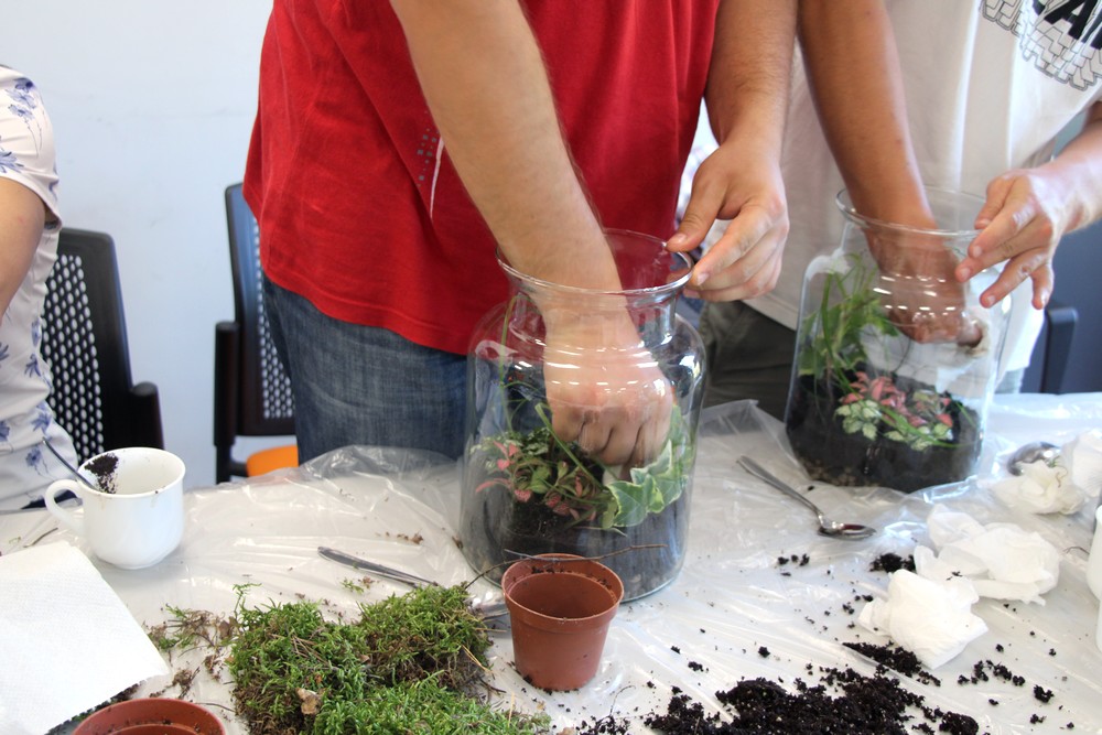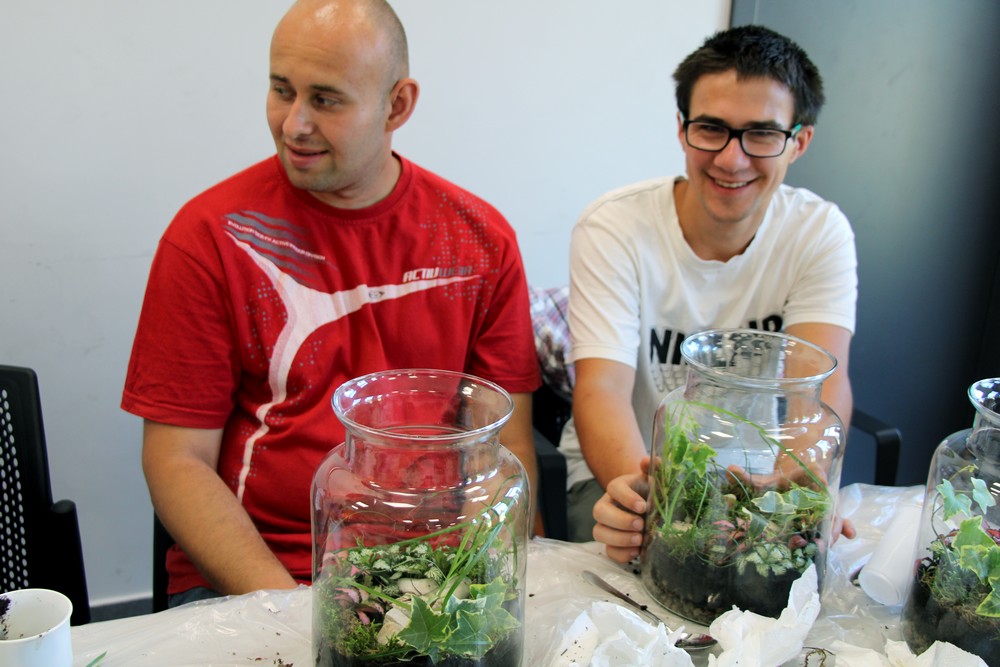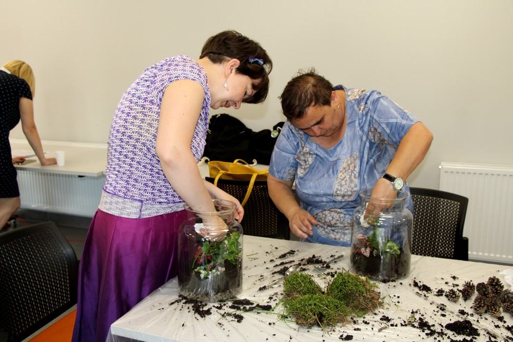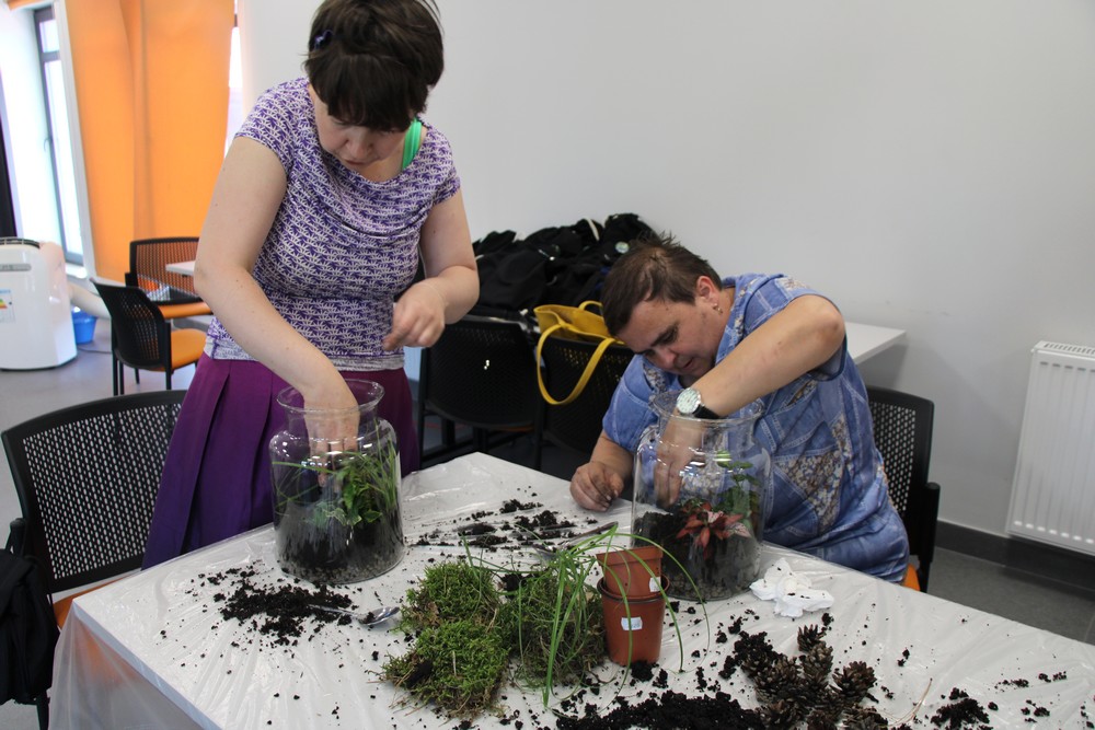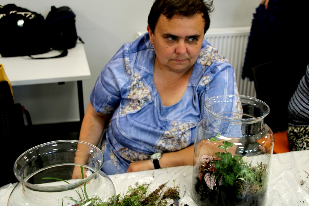 zostawić otwarte i cieszyć się swoim mini lasem. Oprócz Nas były jeszcze 3 grupy z różnych placówek. Warsztaty prowadziła florystka ,która ciekawie opowiadała o różnych roślinach . Nauczyliśmy się , że samemu można roić różne kompozycje rośliny w różnych ciekawych szklanych naczyniach . Inspirujące okazało się to, że można takimi kompozycjami obdarować bliskie osoby tak pomysłowym prezentem. Warto dodać, że był to dla nas miło spędzony czas.