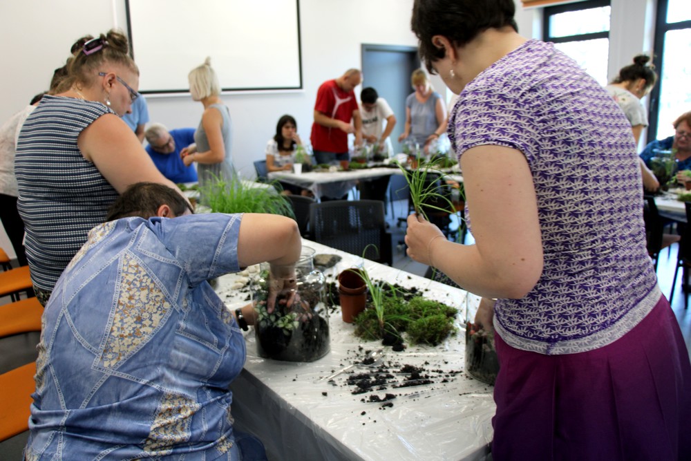 23 czerwca grupa uczestników Naszego Domu Maltańskiego wraz z terapeutami pojechała do Swarzędza na warsztaty florystyczne pt. „Las w butelce”. W trakcie tych zajęć naszym zadaniem było stworzyć mini las w butelce. Wykorzystywaliśmy różne rośliny oraz mech, kamienie, trawa. W celu odtworzenia warunków wzorowanych na naturalnych na koniec pracy, wszystkie nasze kompozycje zostały podlane, a następnie zamknięte na 3 miesiące. W tym czasie będziemy musieli sprawdzać co się z nimi dzieje, jak wszystko będzie dobrze to możemy je zamknąć na stałe lub