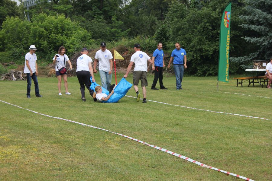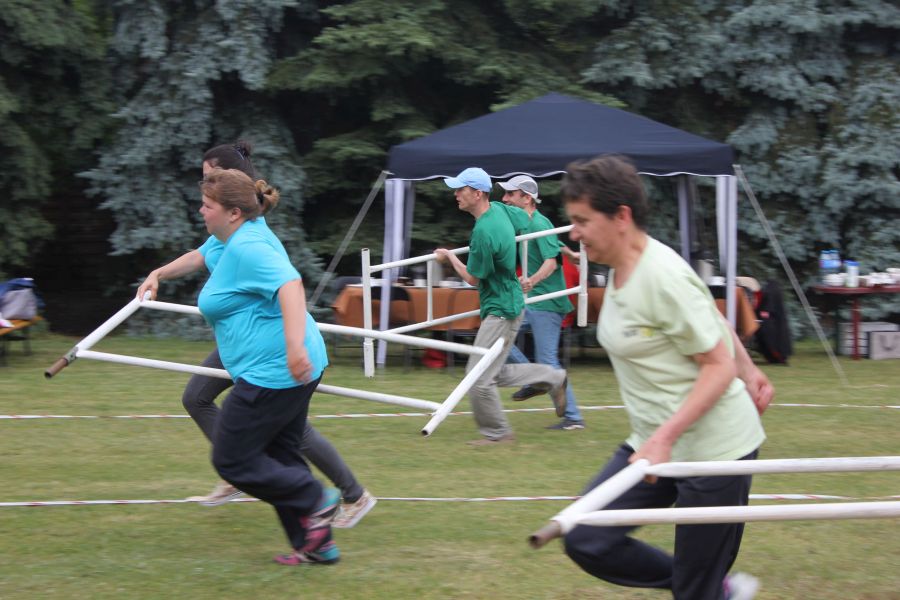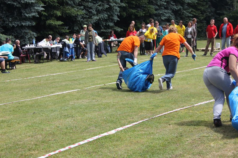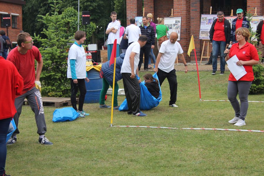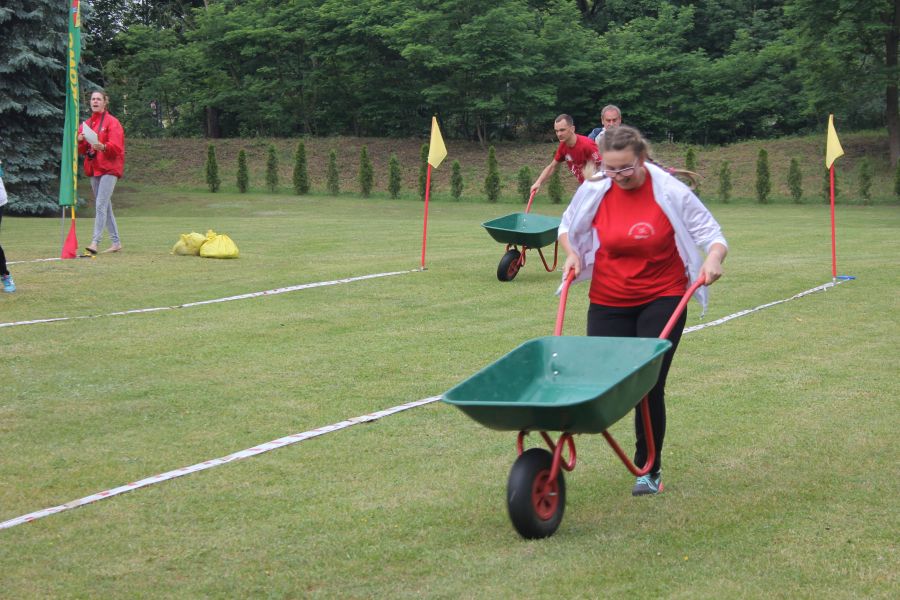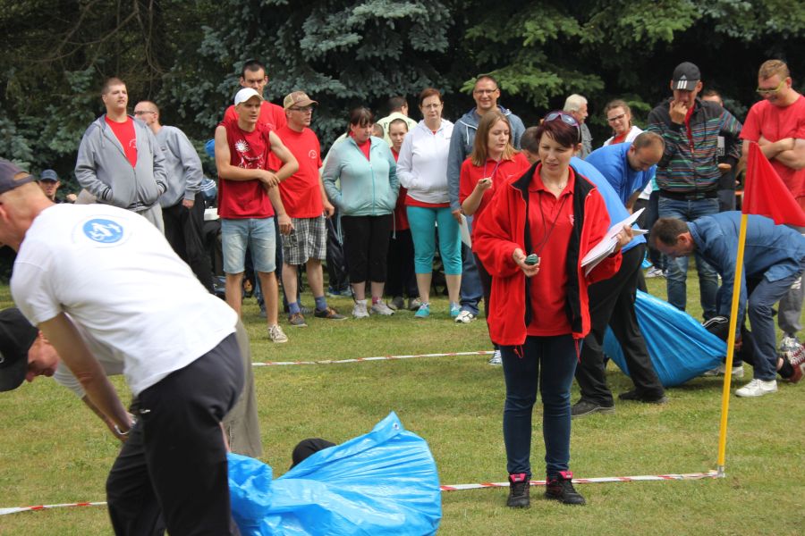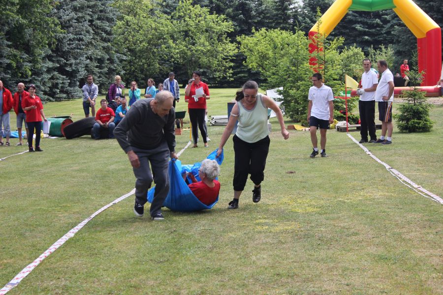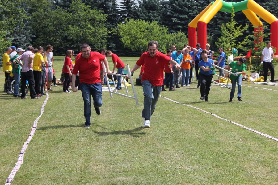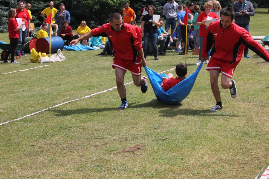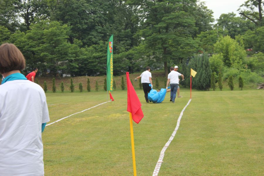 W pierwszej konkurencji – „Ślizgiem po trawie” zawodnicy transportowali swojego najlżejszego kolegę z zespołu – na specjalnym ślizgaczu wykonanym z folii! )