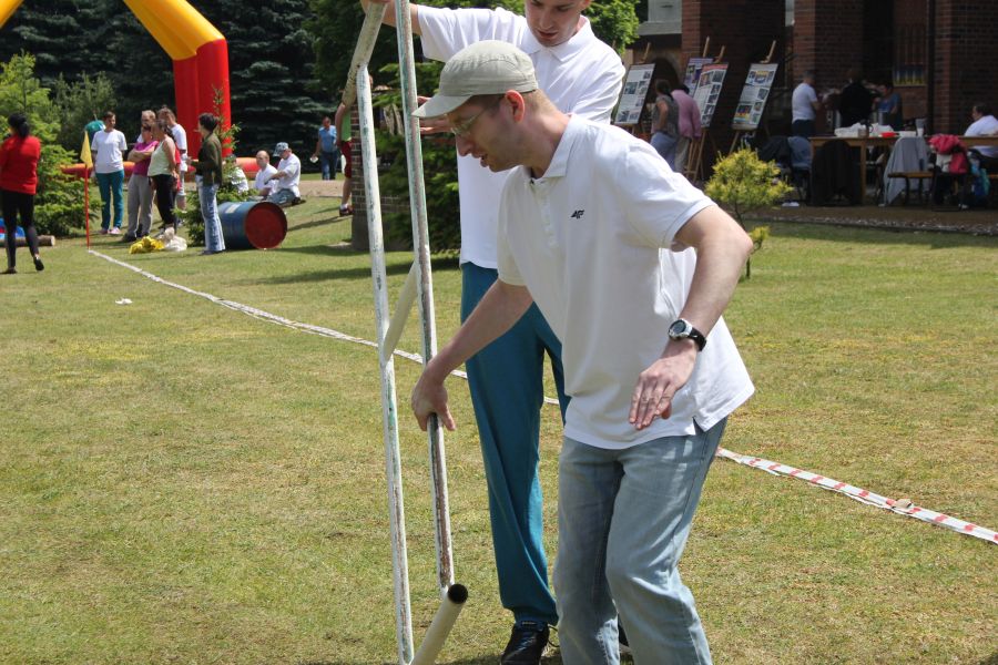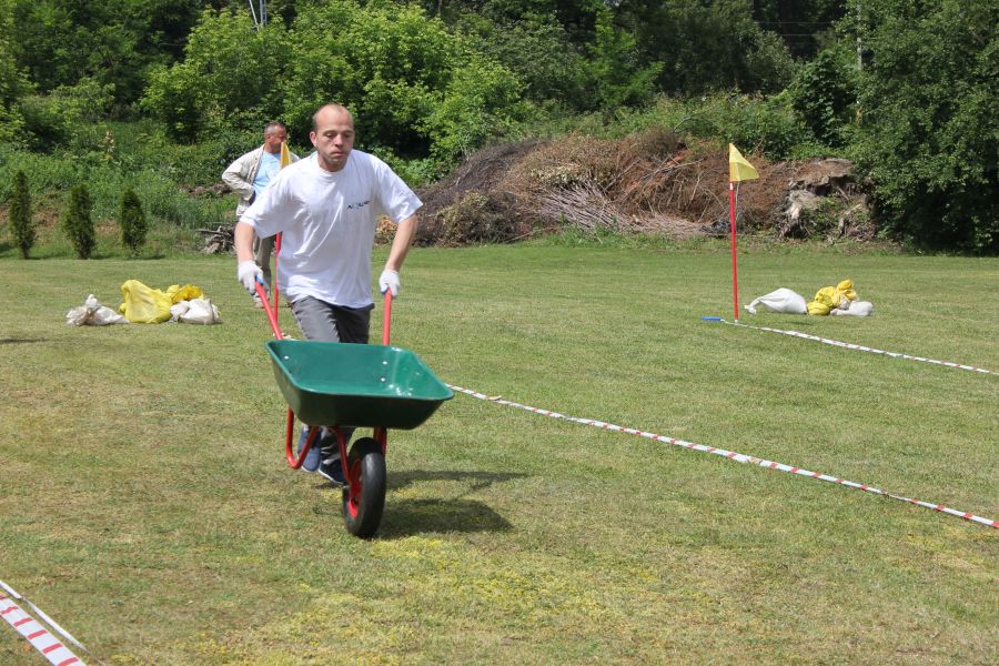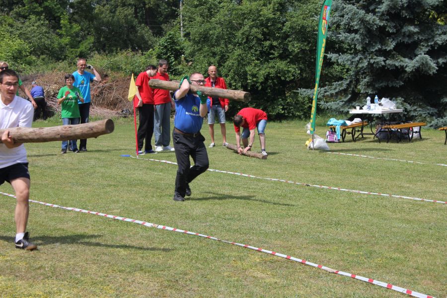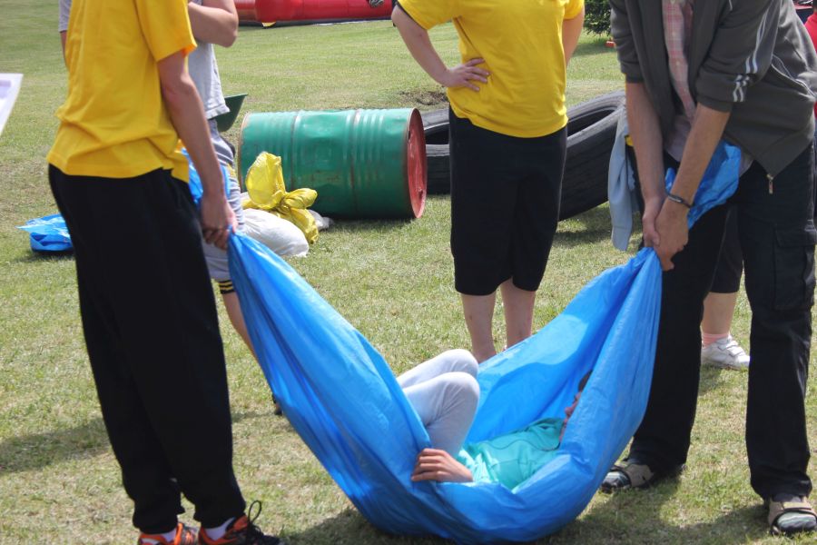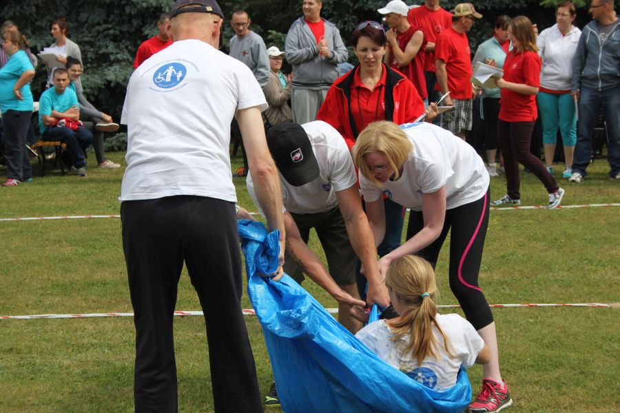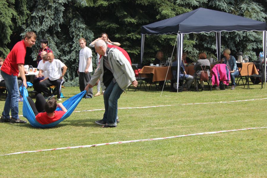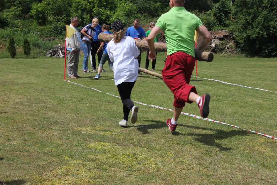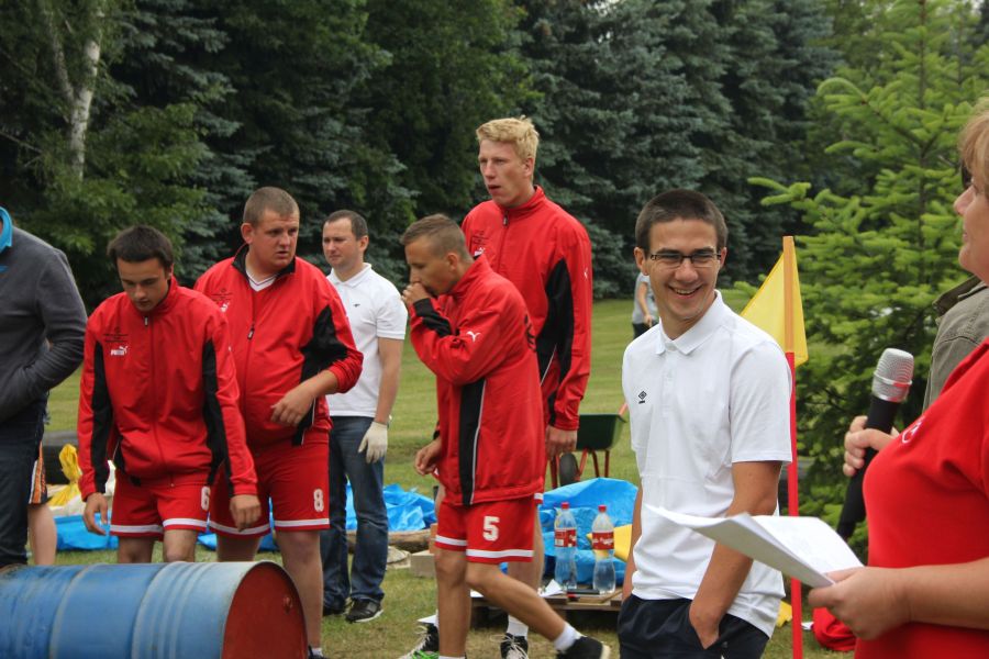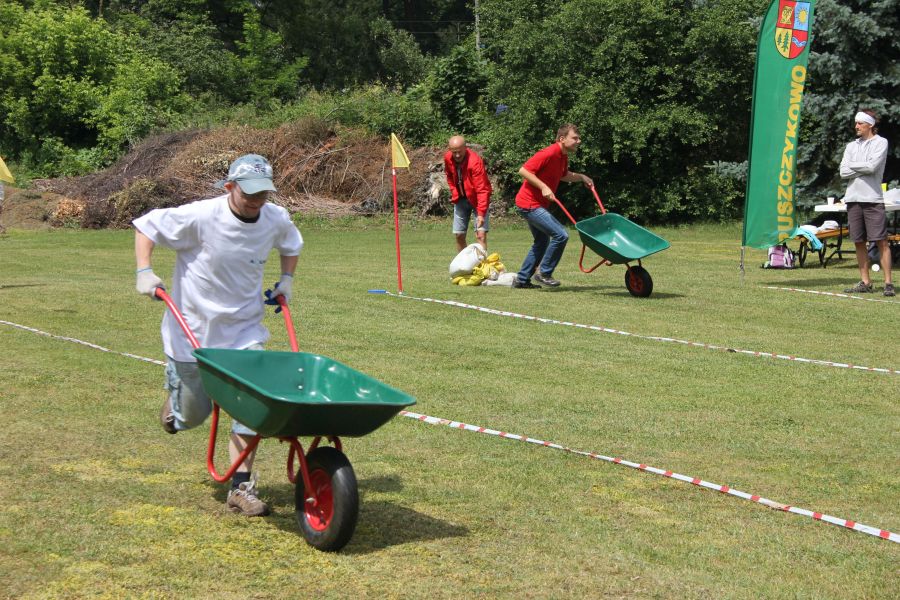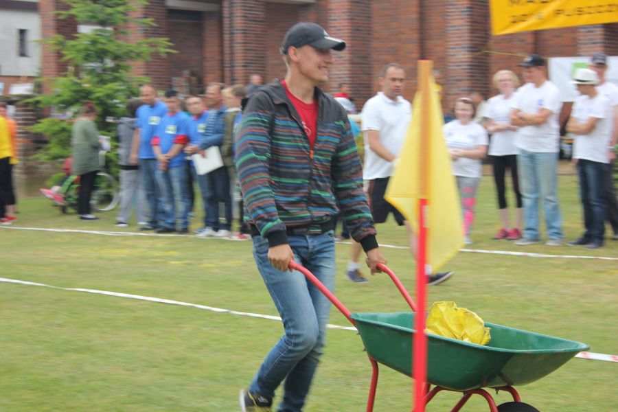 W pierwszej konkurencji – „Ślizgiem po trawie” zawodnicy transportowali swojego najlżejszego kolegę z zespołu – na specjalnym ślizgaczu wykonanym z folii! )