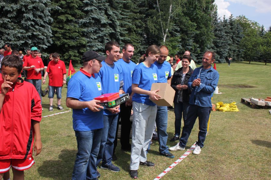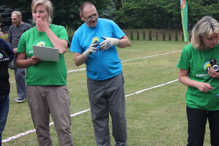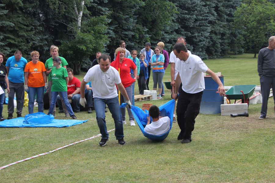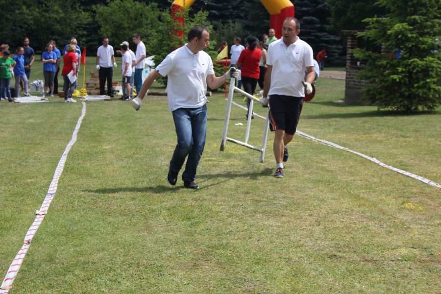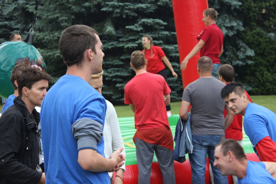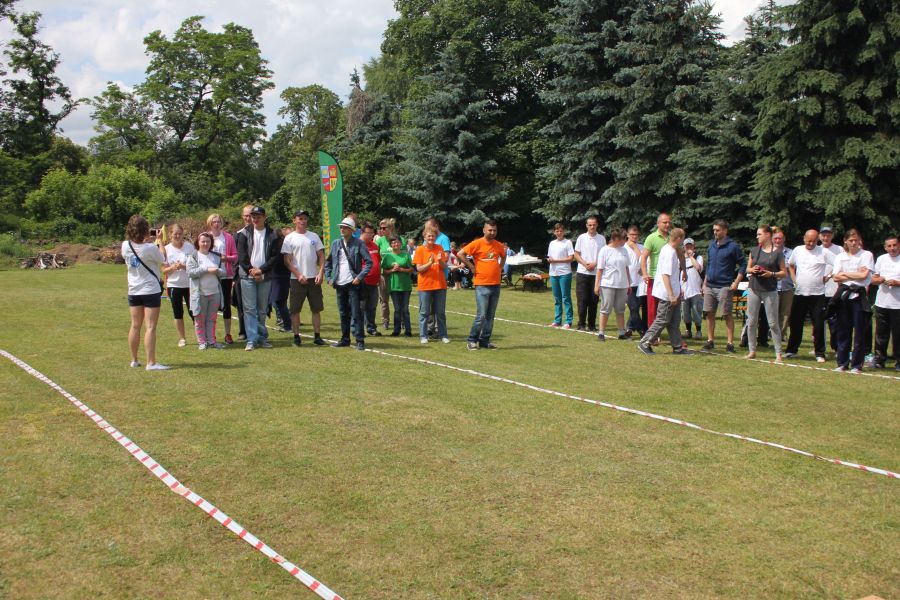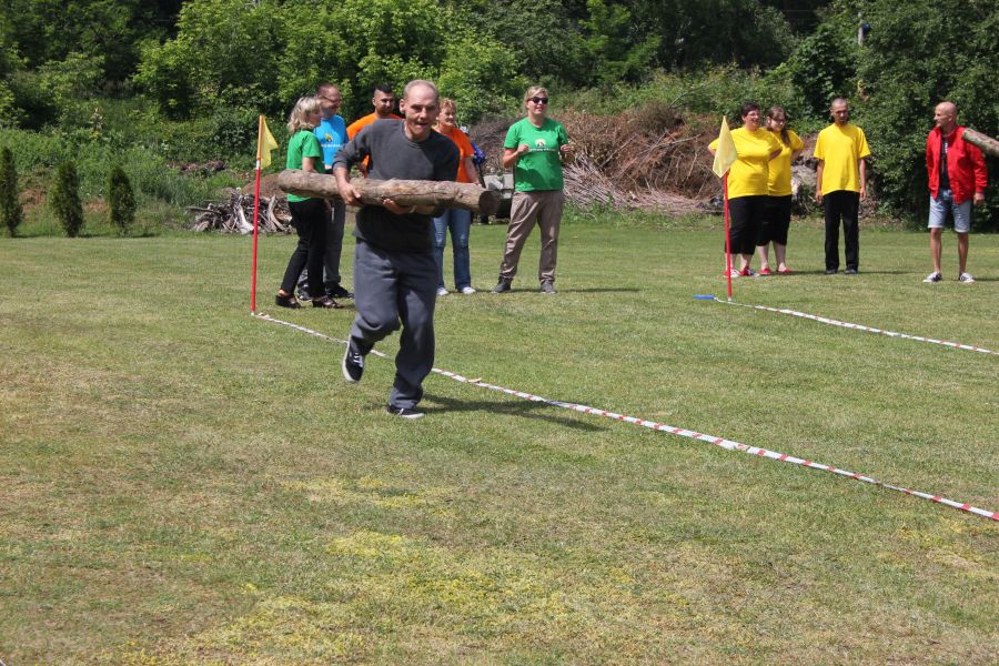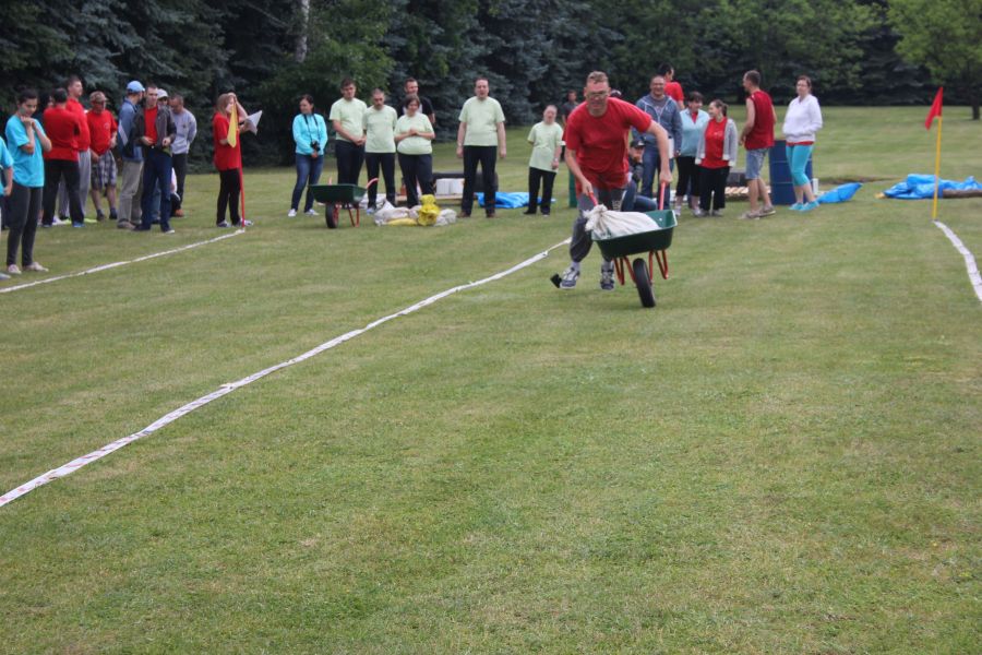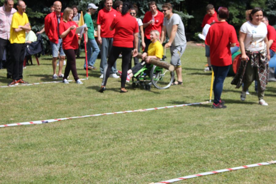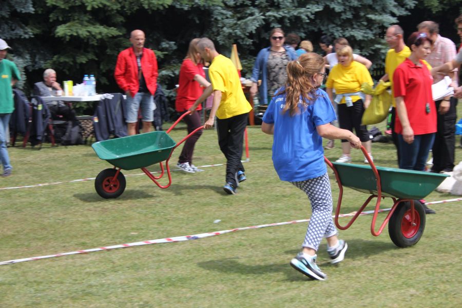 W pierwszej konkurencji – „Ślizgiem po trawie” zawodnicy transportowali swojego najlżejszego kolegę z zespołu – na specjalnym ślizgaczu wykonanym z folii! )