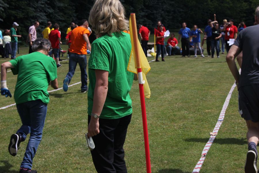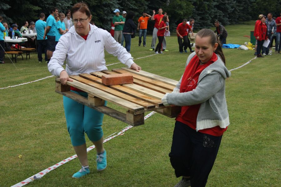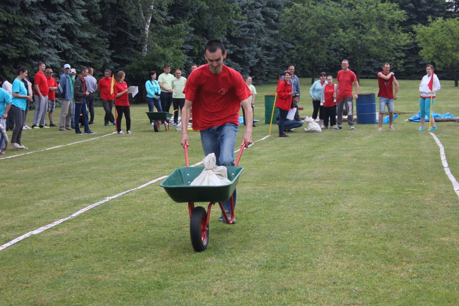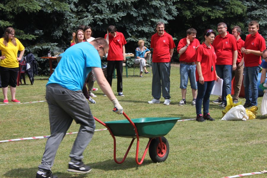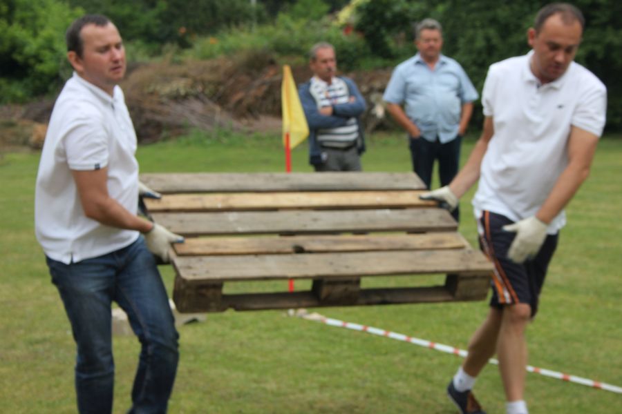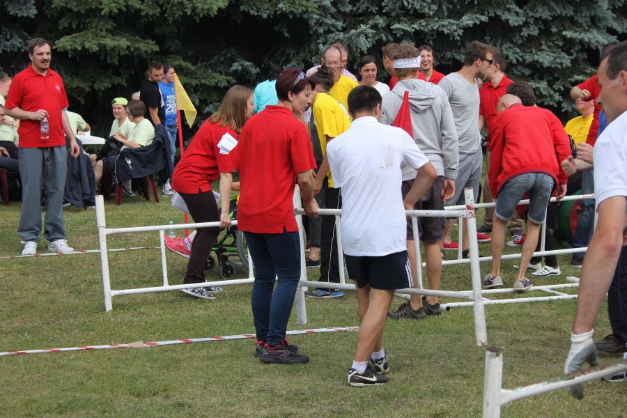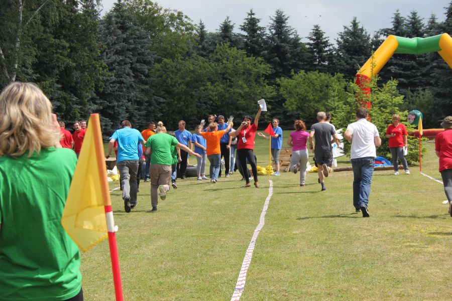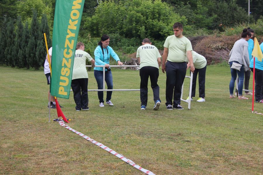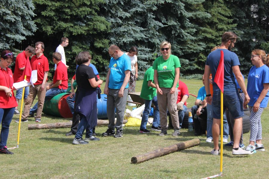 W pierwszej konkurencji – „Ślizgiem po trawie” zawodnicy transportowali swojego najlżejszego kolegę z zespołu – na specjalnym ślizgaczu wykonanym z folii! )